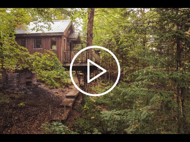 This treehouse is perched on 2 trees, 1 spruce and 1 yellow birch and offers a nice lake view. It has a deck encompassing 1 tree. It is located less than 100 metres from the lake. It is one of the closest treehouses from the reception–pavillion building (a 15 minute walk).