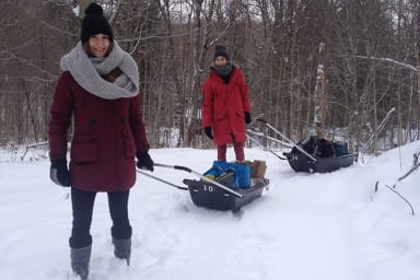 Les refuges sont bien équipées, vous n'avez donc pas besoin d'apporter grand-chose. VOUS TRANSPORTEREZ VOS PROPRES SACS SUR UN SENTIER DE RANDONNÉE, SUR UNE DISTANCE DE 200-1000 MÈTRES (12-20 minutes). Nous fournissons 2 chariots par refuge. Chaque cabane a accès à 1 petit chariot et 1 grand chariot en été OU 2 grands toboggans en hiver. Les sacs à dos facilitent le transport. Portez des chaussures appropriées. Des canoës sont disponibles à la location et peuvent être utilisés pour le transport des bagages (rive Est uniquement), 8 minutes de pagaie.
